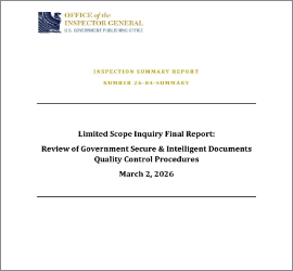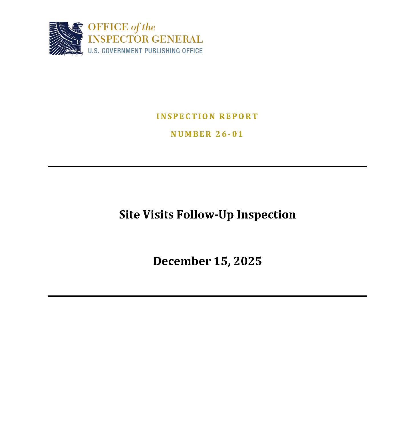 The Inspections Division conducts proactive inspections of GPO programs and operations to identify opportunities to improve efficiency and effectiveness. These inspections are systematic and independent assessments of the design, implementation, and/or results of GPO's operations programs, or policies. They provide information that is timely, credible, and useful for agency managers, policymakers, and others. The GPO OIG's inspections are performed in accordance with the Quality Standards for Inspection and Evaluation issued by the Council of Inspectors General on Integrity and Efficiency (CIGIE).